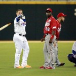 En el quinto los visitantes volvieron a la carga para irse al frente con sencillo abridor de Ángel Sánchez, marcando carrera gracias al tercer batazo de vuelta completa de Luis Mateo, el cual superó la verja del bosque izquierdo para colocar la pizarra 4-2 a favor de los cagüeños. Pero los capitalinos volvieron a empatar el desafío cuando en el sexto Christian Vázquez conectó doblete al derecho, seguido de transferencia a Juan Centeno, siendo forzado el primero en intento de toque de Jonathan García.
